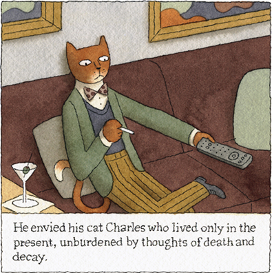 “This year’s theme is ‘the hereafter.’ I wanted to create a character who is skeptical of the notion of an afterlife, yet amuses himself by imagining he is receiving signs from the dead. The title is Dispatches From Oblivion. This issue of BLAB (newly rechristened BLAB WORLD and now printing in hardcover) will be published this Fall by Last Gasp/San Francisco.”