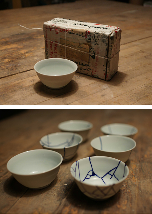 “We handmade 15 bowls of the same design and shipped them to various countries. Our recipient: Yves Klein. An iconic figure in French monochronism, Klein patented the color ‘International Klein Blue’ with which he attempted to visualize the invisible. The bowls sent to Klein, now deceased, traveled to countries such as Turkey, Japan, Egypt, and Brazil. They returned to us as invalid mail. One box came back strewn with rough scribbles, while another came back wrapped over with foreign postal tape. After three months, only six returned. The damaged boxes reflected rough travels across borders. Out of the six bowls, five were broken; only one came back intact.